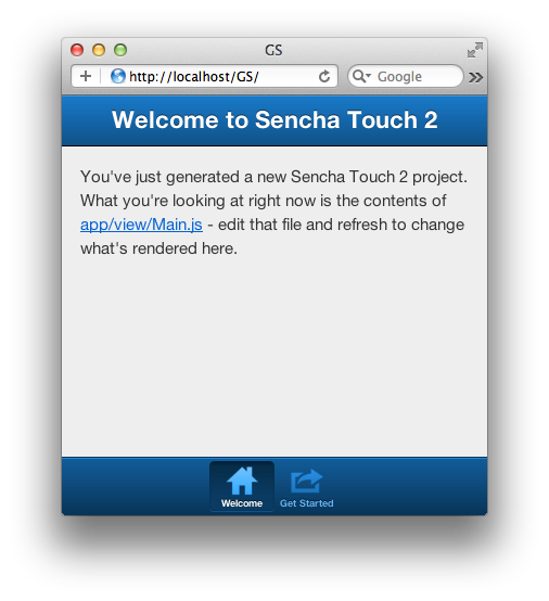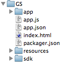 2.[INFO] Created file /Users/nickpoulden/Projects/sencha/GS/.senchasdk3.[INFO] Created file /Users/nickpoulden/Projects/sencha/GS/index.html4.[INFO] Created file /Users/nickpoulden/Projects/sencha/GS/app.js5....這將會(huì)產(chǎn)生一個(gè)叫做GS的Sencha Touch應(yīng)用骨架,放在../GS目錄下。骨架應(yīng)用中包含了所有你創(chuàng)建一個(gè)Touch應(yīng)用所需要的東西,包括默認(rèn)的index.html,一份Touch SDK的拷貝,CSS,圖片和打包你的應(yīng)用所需的配置文件。